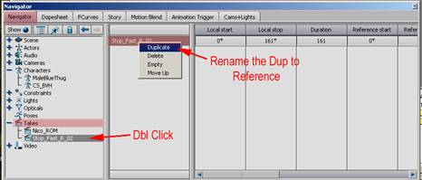 12. In the Navigator under the Takes tab, Dbl click on the name of the animation you are working on. Right next to that, there is a column that has a listing of that same animation. Right click on it and pick duplicate. Rename it to Reference. You will use this as a fall back in case you make a mistake. (EX: Let’s say that you have created these “fall back” layers and you have taken the animation to its export stage, but something needs to be changed in the animation of the control rig (Step 12 and 13). If you go into the takes drop down and pick the Reference node, you will be able to adjust your work. If you hadn’t done that, your control rig would have been deleted and you would have been stuck starting over.