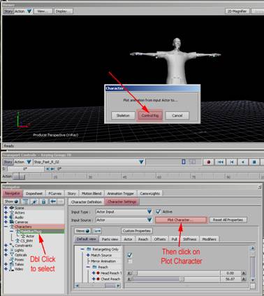 13. Go back to frame 0. In the Navigator under Characters, double click on your character. Then In the Character Settings, click on Plot Character. Choose Control Rig.