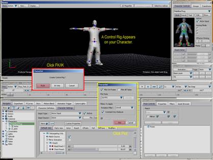 14. Then Choose FK/IK. Another box shows up. Leave everything on default and choose Plot. A Control Rig appears on your character. This will be used to fix any animations that are not looking good on your character. In this case, the characters arms are going through the abdomen.