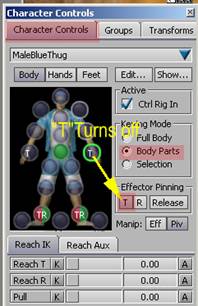 15. Go into the Character Controls Pane. I want to be able to rotate my arms with the control rig freely. Therefore, I set the following: Keying mode to Body parts so that I select and affect just the arm chain. Pick each hand circle and notice the T in the middle of it. This means that the hands translation is pinned. Since I want to rotate the arm from the shoulder, I don’t want the hand pinned and will therefore turn it off by clicking on the T in the Effector Pinning area. Do this for both hands.