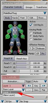 17. Right below the Character controls is the Key Controls. This is where you will do most of your keyframing. However, you will notice that the time line has a key frame on every frame. To tweak this information would be very difficult. Therefore, click on the pull down where it says base layer and pick Layer 1. Notice that the keyframes went away. What actually happened is that you added a layer on top of those keyframes that will allow you to edit the information cleanly. Next to that are several buttons. Key is what you press when you want to make a regular keyframe. Flat will add a key, but it will keep the Fcurve handles flat. Zero will bring your rotation values back to their normal state for that frame.