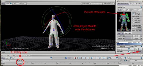 18. Pick the Cell for on of the arms in the Character Controls. Make sure that you are in Local Space rather than World Space (F2=local, F3=world). Edit the data by scrubbing the animation. Look for the point where it starts to get bad and then set an anchor key (key where you have made no adjustments).