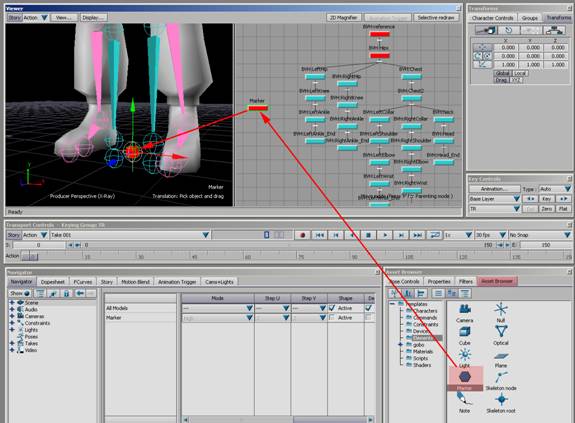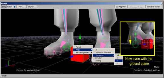 10. The end effecter on the feet depicts where the ground is on the CS_BVH. Therefore, you need to align it with something that is on the ground plane such as the Marker that you just pulled in. Grab the end effecter and Alt+drag it to the Marker. Let go of the mouse and choose Align>Transition>Y. This brings it down only in the Y axis. Once you have done both feet, delete the marker.