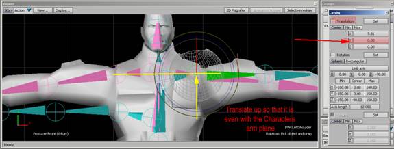 11. Now come the clavicles. Go into the Front View (Ctrl+F). SBC a Clavicle. Go to Edit>Transforms>Limits. A box pops up. Under the Translations part, enter random numbers in the Y section until the Shoulder Joint, NOT THE CLAVICLE, lines up with the characters shoulder joint in Y. Do this for both sides. Close the limits box when you have finished. NOTE: On the CS_BVH, the Clavicles are only able to move in the Y direction. Attempting to unlock them and move them in the X and Z will cause big problems.