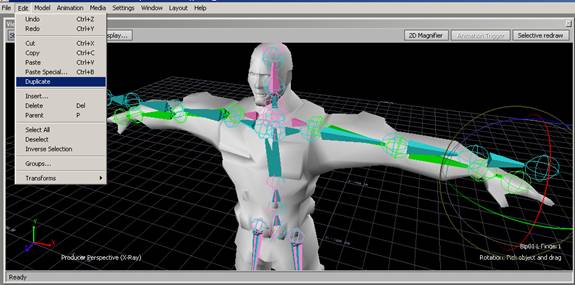 12. Next, SBRC the Character’s Arm Chain on both sides. Go to Edit>Duplicate. Since the Clavicles on the CS_BVH can’t be moved to match the clavicles on the character, we duplicate the characters arms so that we can bring them to the CS_BVH. We need the rotations to be at 0 no matter what, but we can match the angle of the Characters Skeleton by snapping the CS_BVH arms to the duplicated Character arms.