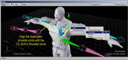13. Translate the duplicated arms in the Z axis. Then pick one of the arm joints and Align it to the Arm joint of the CS_BVH. Now the duplicated Characters arms are in line with the arms of the CS_BVH.