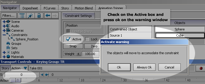 Go back to the beginning of the animation. Uncheck the Active box under the Constraint Settings. Notice how the sphere goes back to its original position.