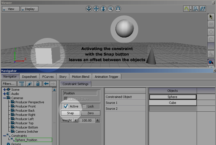 Click on the snap button to activate the constraint while leaving the original offset. When you play the animation the sphere moves half with the sphere and half with the cone (mov 3).