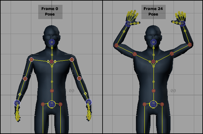 Since we have been keying on Body Part mode, every element of both arms has been key framed and the FK controllers as well as the IK controllers are synchronized.
