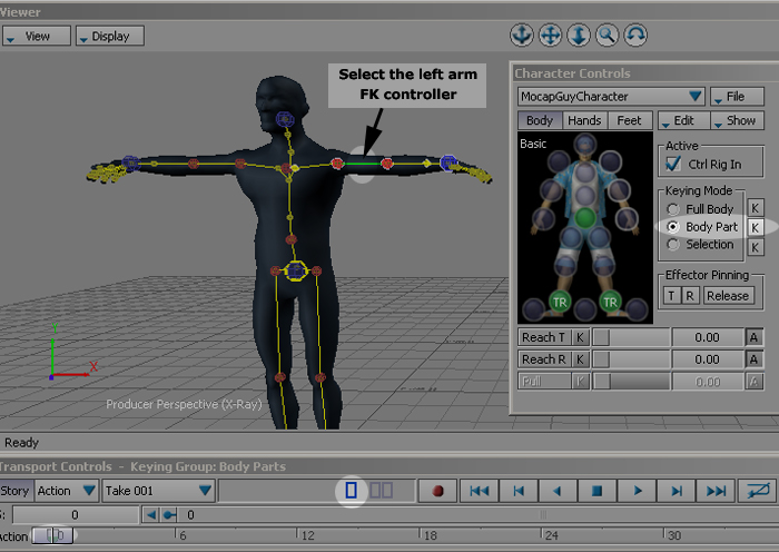 Of course the left arm which is driven by FK controllers moves more natural because it moves in an arc which is one of the basic principles of animation. Although when you are selecting elements in the Character Controls window you are basically posing your character through the use of IK controllers. But until you activate the Reach T and Reach R of a section, you will be driving its elements with the FK controllers.