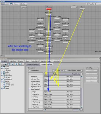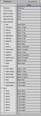 23. Open your adjusted CS_BVH (see: Fitting a BioVision Skeleton to a Character Studio Skeleton (CS_BVH)) and “Append” it into the scene. If you don’t have one already made, you can bring the default in and create it here following the how to instructions. 24. Characterize the CS_BVH just as you did for the Model Character by first dragging in a character from the asset browser. Then assign it and chacterize it the same way you did with the model above (Steps 18-22). NOTE: You should use the same “Floor” marker when you are assigning the joints in the Character Definition Pane. 25. Save out the file. This will now be used to review and carry all other *.c3d’s to their final stage.