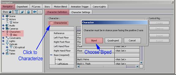 21. Once that is done, check the “characterize” box. An option box will pop up. Choose Biped. Since all people name things differently, by doing this, you are giving Motion builder a way to recognize your naming convention.