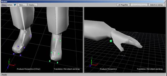 22. Once that is done, green and purple markers will appear by the hands and feet. These dictate where the floor is. Once they are aligned, the feet should not dip below the floor. Align the green and purple markers so that they are in line with the feet. The heels and toes are the most important part to line up. The middle markers should be at the ball of the foot joint. The markers should be under the mesh and on the ground plane. When you move one marker, the opposite marker and the marker on the other foot move in conjunction with it. Do the same for the hand markers. On the hand markers the fingers don’t need to be included.
